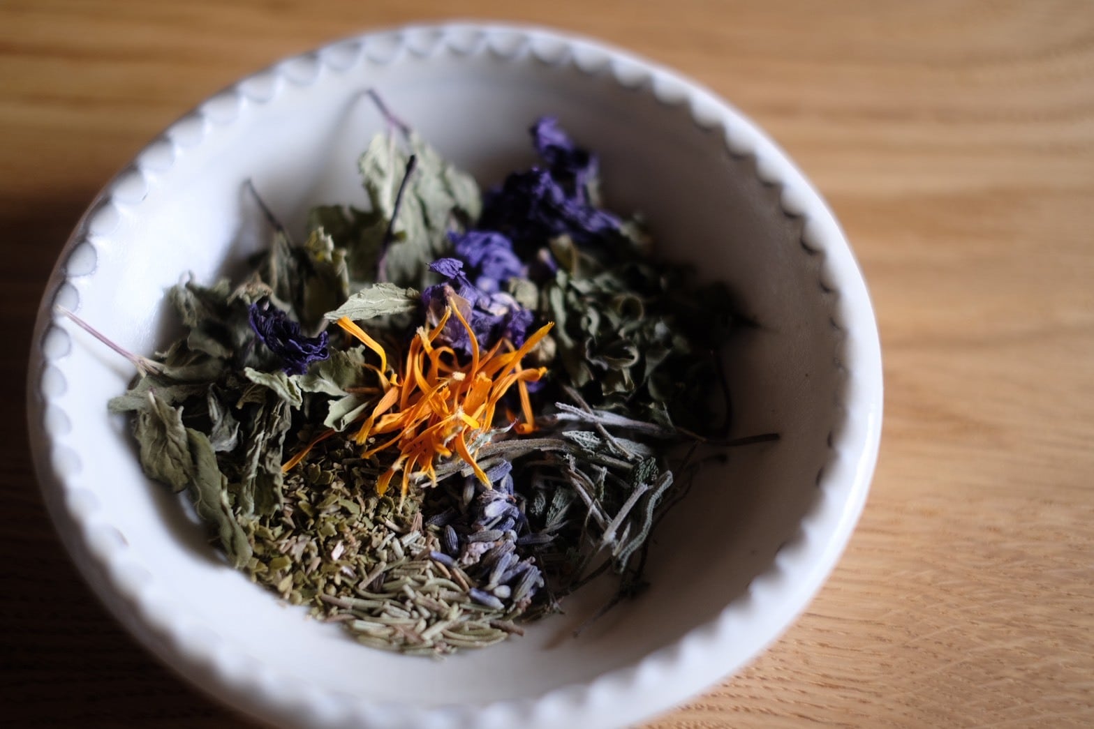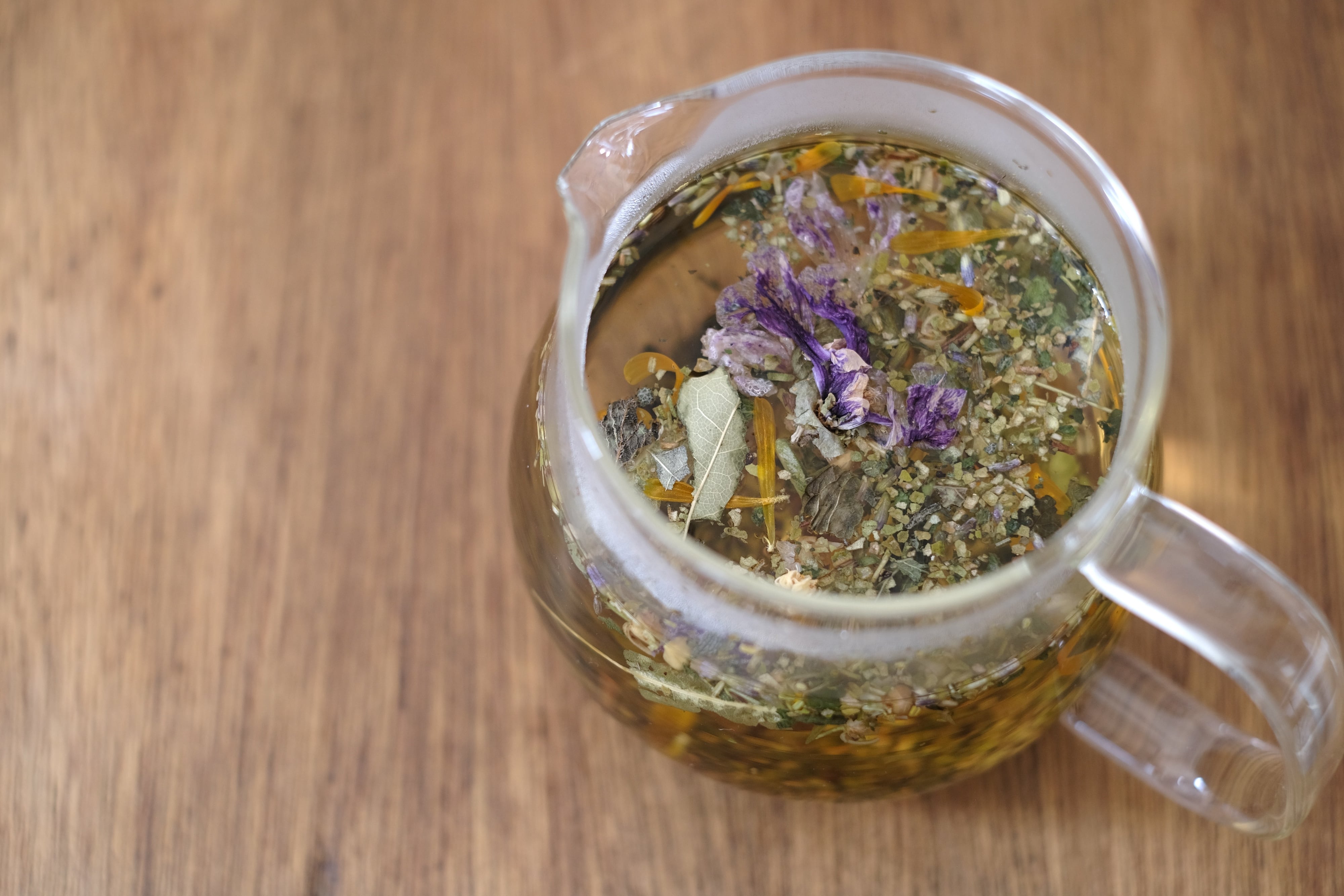 お茶の内容:レモンマートル・セイジ・リンデン・レモンバーベナー・ローズマリー・ラベンダー・スペアミント・ブルーマロウ・カレンデュラ・レモンピール